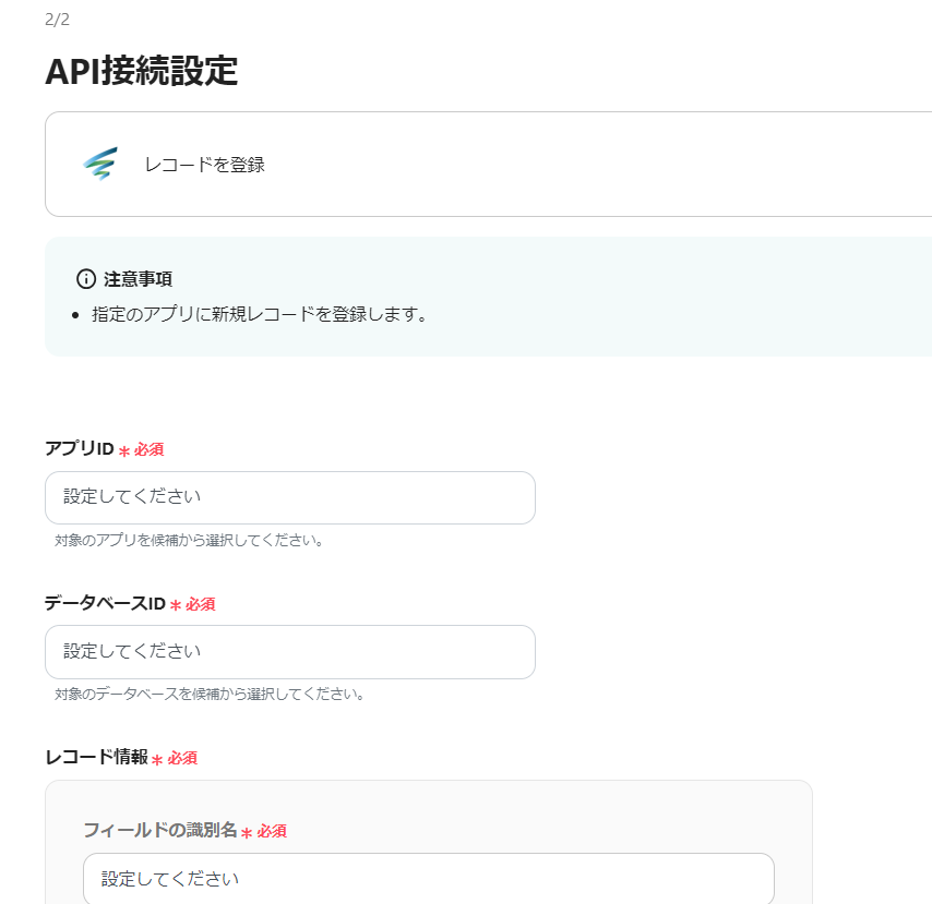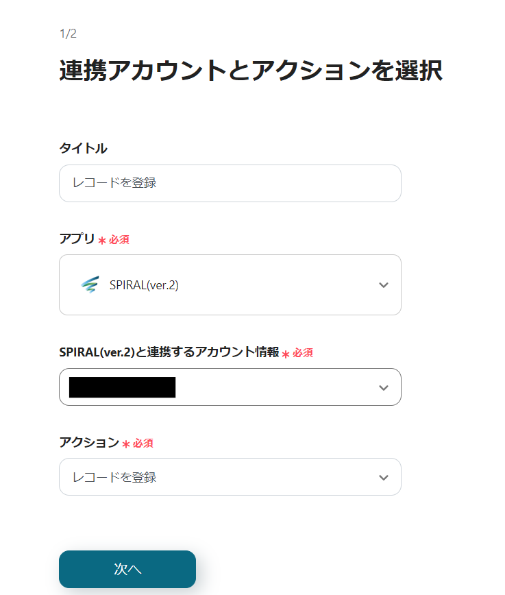 7) アクションは「レコードを登録」を選択し、「次へ」をクリックします。