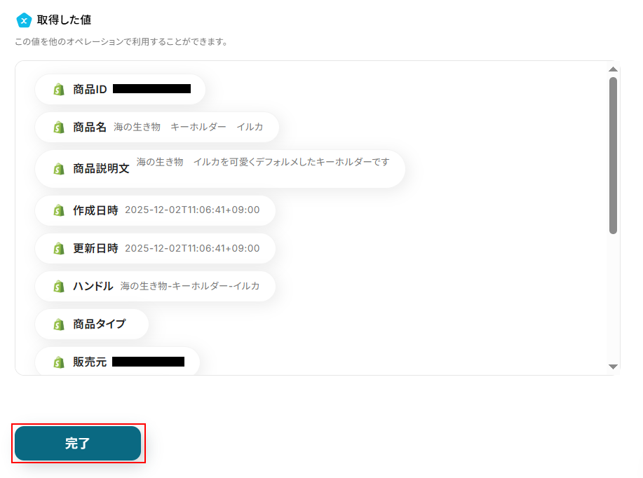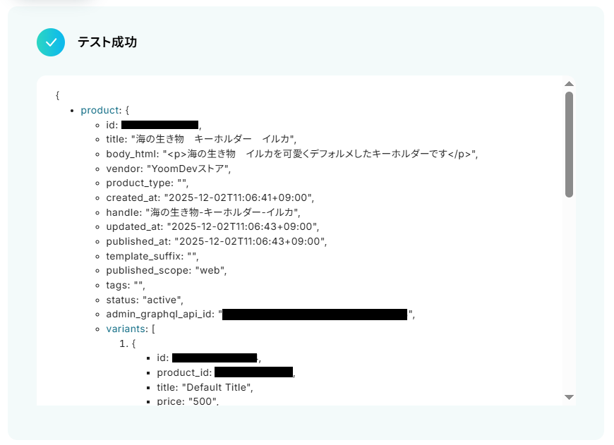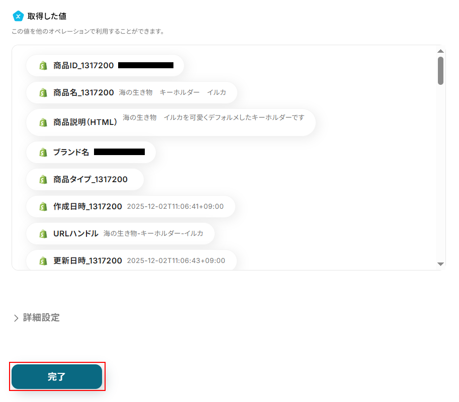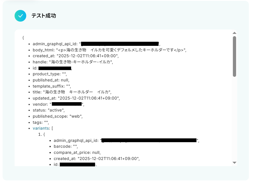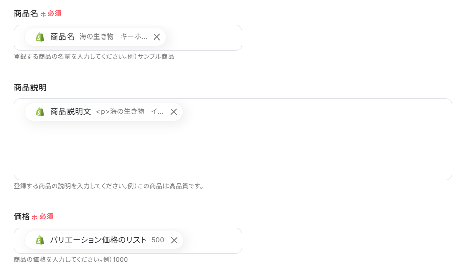 - Shopifyから取得した各種商品データ(例:商品説明、SKU、在庫数など)を、BASEの対応する各項目に変数として正確にマッピングすることで、詳細な商品情報を自動で同期させることができます。