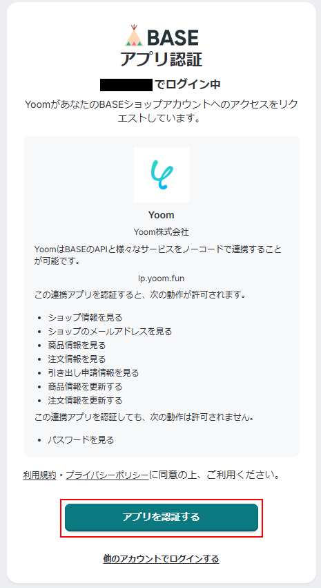 表示内容を確認し、問題なければアプリを認証するをクリックしてください。