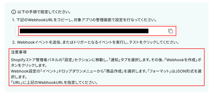 以下の画面のWebhookURLをコピーし、注意事項に従ってWebhookの設定を行ってください。