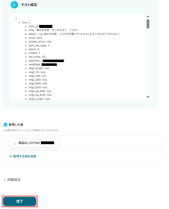 テストに成功するとテスト成功画面と取得した値が表示されますのでご確認ください。