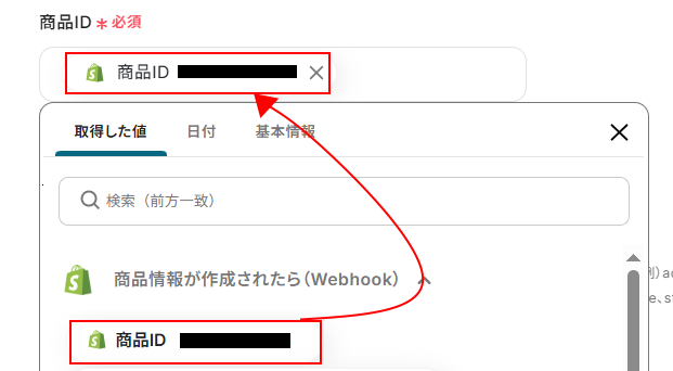 - 次に、オペレーションでShopifyの「商品情報を取得する」アクションを設定し、トリガーで作成された商品情報を取得します。