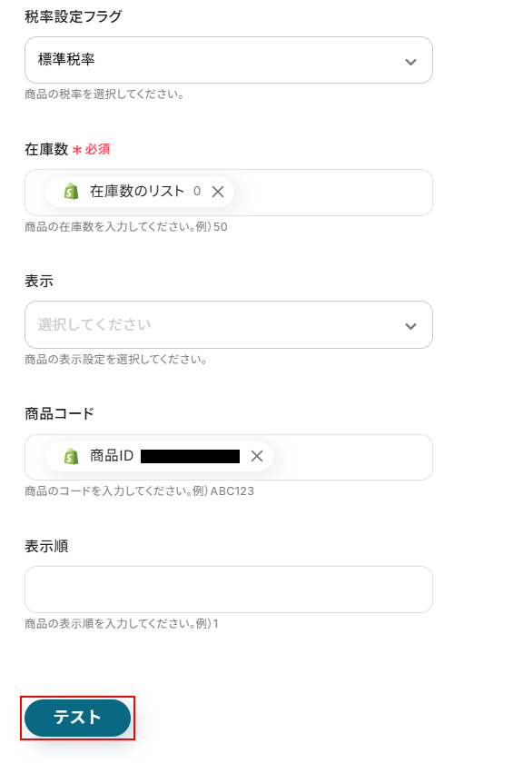 商品情報が作成できたらYoomの画面に戻りテストをクリックしましょう。