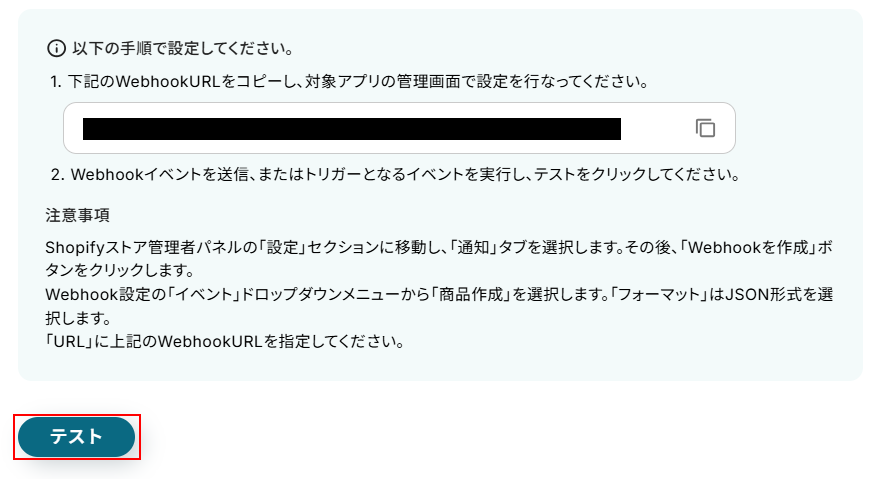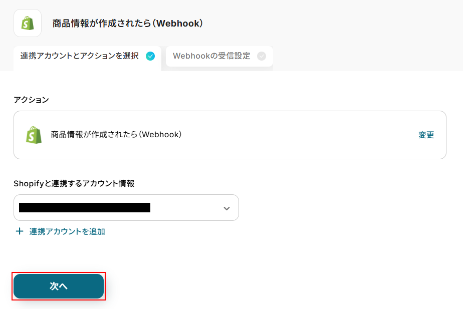商品情報が作成されたら(Webhook)をクリックします。