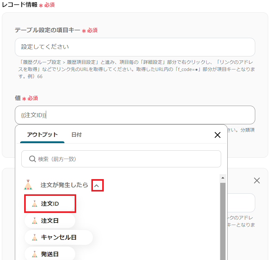 他の必須項目も同様にアウトプットを利用して設定してください。