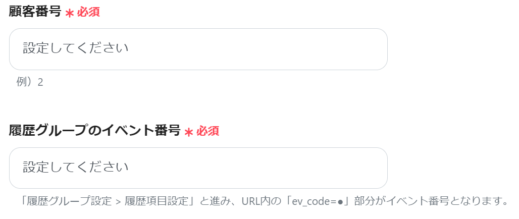 以下の画面が表示されたら、説明を確認して「顧客番号」と「履歴グループのイベント番号」を設定しましょう。