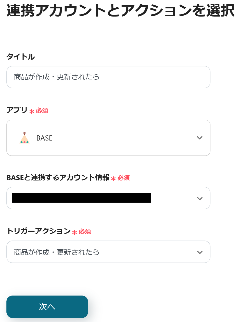 最初にBASEの設定から行うため、「商品が作成・更新されたら」をクリックしてください。