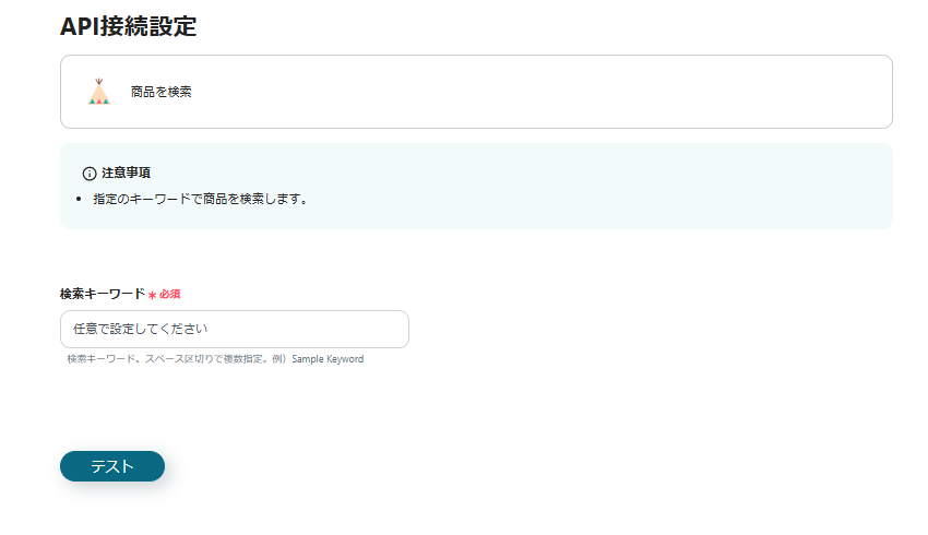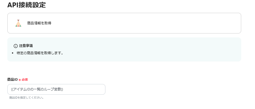 以下の画像のような画面が表示されます。 既に「商品ID」の箇所に「{{アイテムIDの一覧のループ変数}}」と入力されているため、そのまま「テスト」→「保存する」をクリックしましょう。