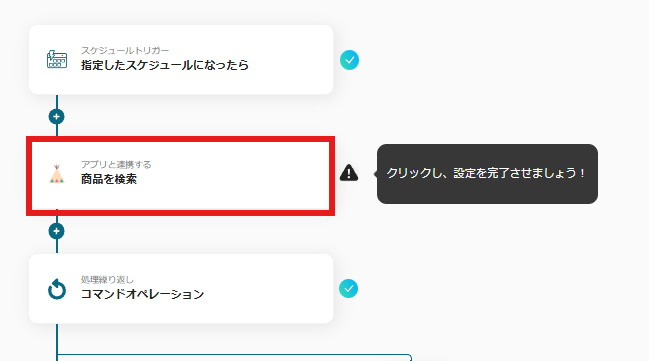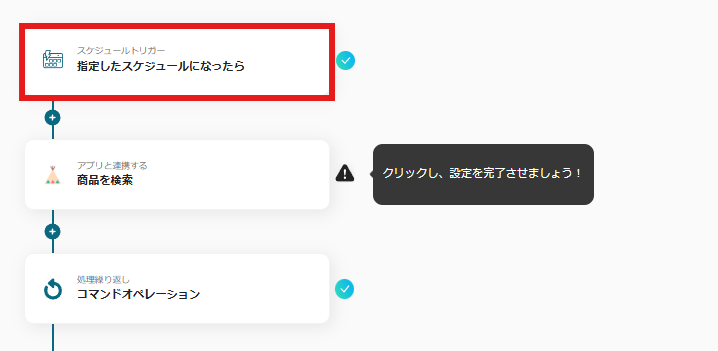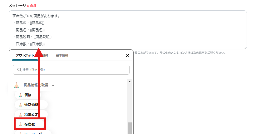 以下のようにこの箇所でもアウトプットを活用し入力しましょう。 スケジュールトリガーが起動し、指定の時間になったら、 在庫数が0になったこと、またその商品情報を受け取れるように入力しています。