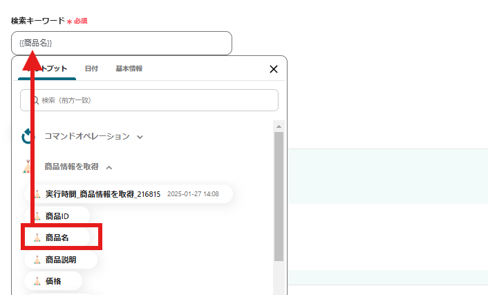 Gmailのトリガー設定では、自動化の対象としたいメールを特定するためのキーワード(件名、送信元アドレスなど)を任意に設定してください AI機能の設定では、トリガーで取得したメール本文などを変数として利用し、商品名や価格、商品説明文といった抽出したい項目を自由にカスタマイズできます BASEに商品を登録する際には、AIが抽出した情報を変数として各項目に設定したり、特定の値を固定で入力したりすることが可能です BASEに商品画像を登録する際も同様に、AIが抽出した情報を設定できます ■注意事項