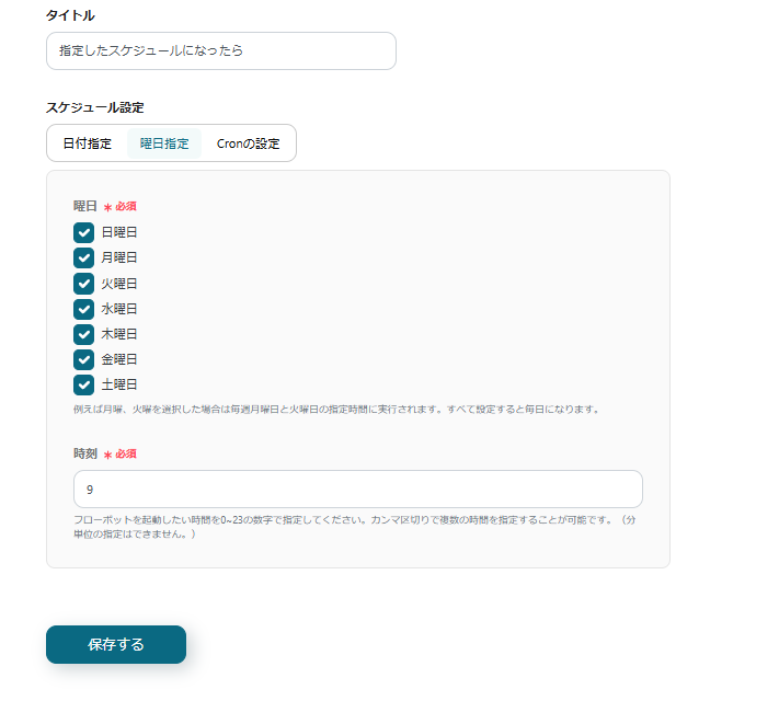 このテンプレートでは、毎日9時にBASEで商品情報を取得するよう設定されています。 もし通知を受け取りたくない曜日など変更が必要であれば変更し「保存する」をクリックしましょう。※ここで設定した曜日と時間に通知が届くようになります。