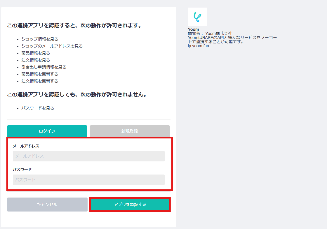 以下の画像のような画面が表示されますので、BASEのアカウントでログインを行いましょう。
