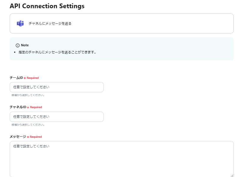 Slackのトリガー設定では、メッセージの投稿を検知したいチャンネルを任意で設定してください。 Microsoft Teamsのオペレーション設定では、通知を送信したいチャネルや、送信するメッセージの本文を任意で設定することが可能です。