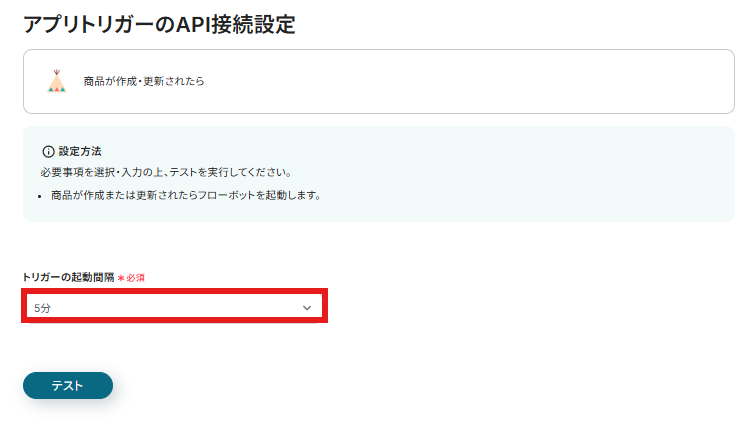このステップでは、BASEに商品が登録・更新されたことをYoomのAPIを使用して検知し、フローボットを自動的に起動させるための設定を行います。