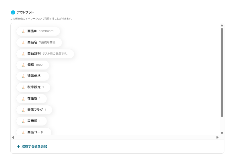 テストを行うことで連携したアプリからアウトプットを取得することができます。このアウトプットは、後続のオペレーション設定時に値として使用することができ、フローボットを起動する度に、変動した値となります。詳しくはこちらをご参照ください。