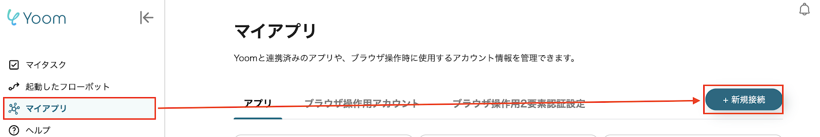 Yoomの画面左側にある「マイアプリ」をクリックし、右側に表示される「新規接続」をクリックしてください。