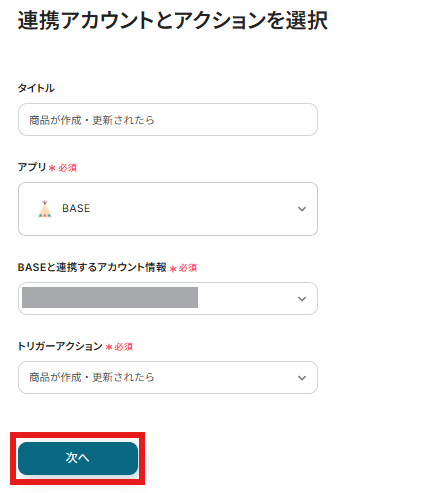 クリックすると、連携アカウントとアクションを選択する画面が表示されるので、今回連携するBASEのアカウントで間違いないか確認しましょう。確認後「次へ」をクリックします。