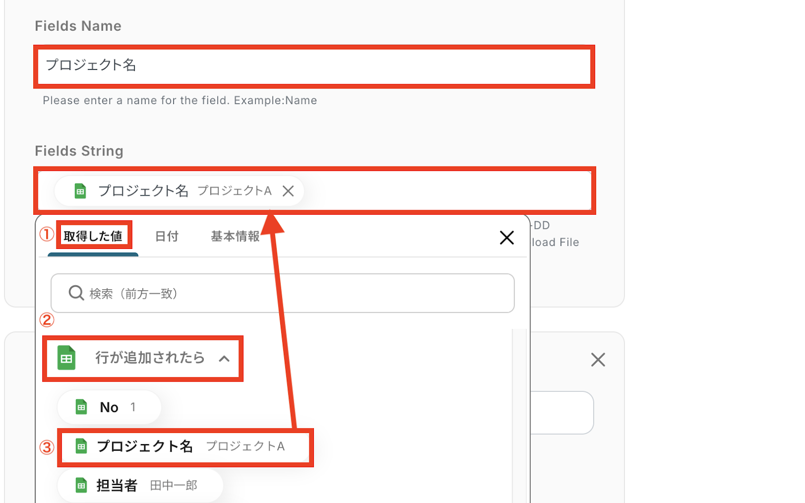 次に「Fields」を設定していきます。 「Fields Name」はBaserowで作成したTableに合わせてください。 「Fields String」はステップ3で「取得した値」を活用して入力しましょう! 【取得した値の活用方法】 ①入力欄をクリックして「取得した値」を表示 ②「行が追加されたら」をクリック ③「プロジェクトA」など入力したい内容を選択