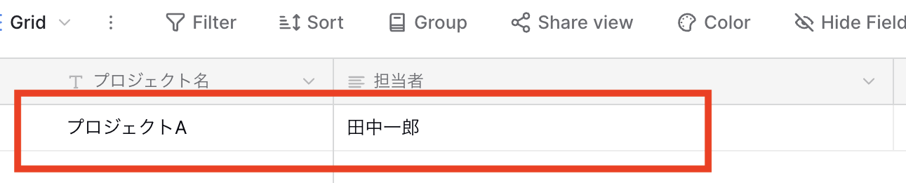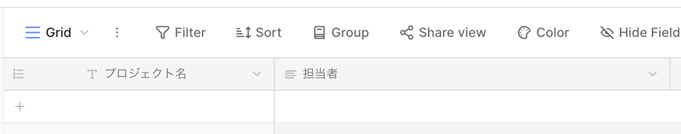 まずは事前準備として、BaserowでTableを準備します。 ※今回はテストなので「プロジェクト名」と「担当者名」のみの様式を作成していますが、業務に合わせて作成してくださいね!