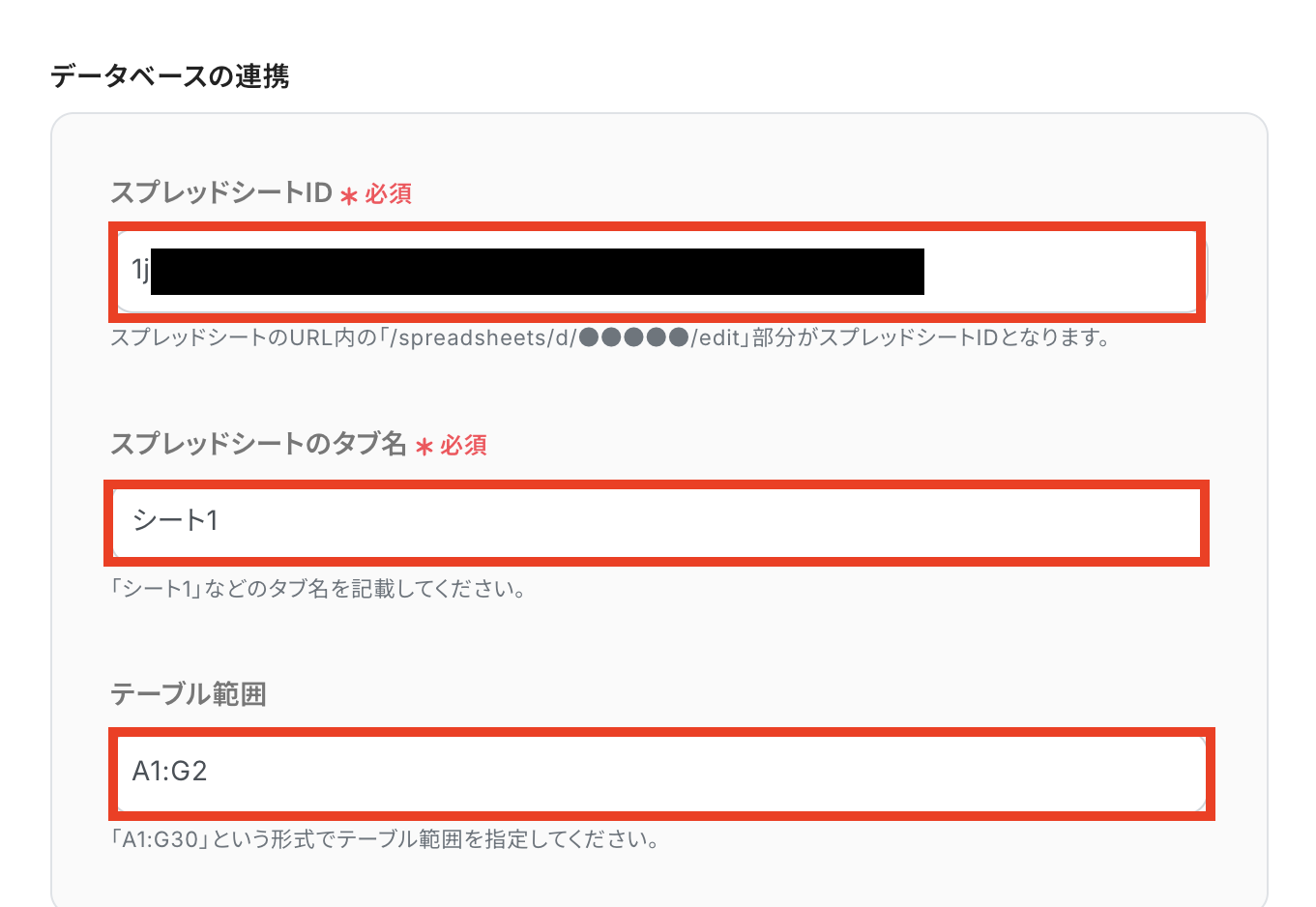 次にデータベース連携を行います。 ステップ3で連携したシート(BaserowIDを入力する欄を作成しておいたシート)の情報を入力します。 「スプレッドシートID」と「タブ名」は候補から選択してください。