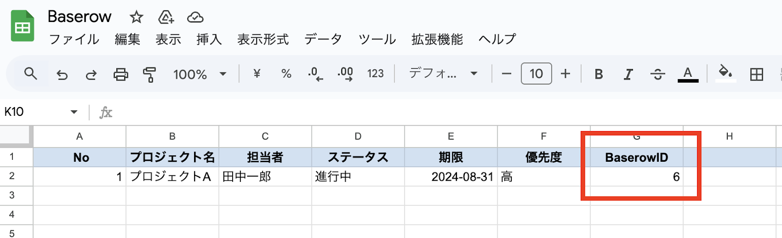 ※すでにBaserowへの追加が完了していますが、Google スプレッドシートにステップ4で取得した「Baserow ID」を記載しておくことで今後、更新作業などをする際に便利になります!そのため、Google スプレッドシートの「レコード更新」作業を行っていきましょう。