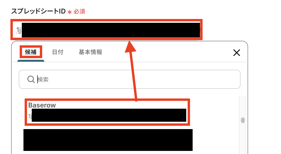 「スプレッドシートID」を候補から選択します。 入力欄をクリックすると、候補一覧が表示されるので連携したいファイルを選んでください。