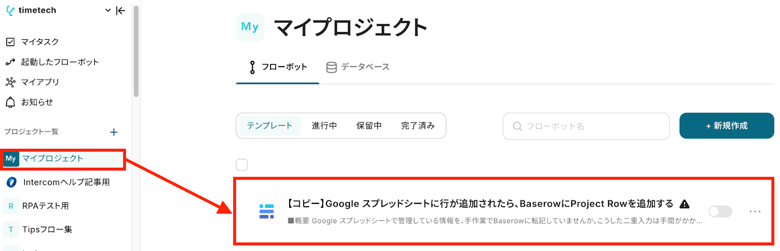 左側にあるメニューの「マイプロジェクト」から、コピーしたテンプレートを開きます。 (※テンプレートをコピー後、すぐに設定する場合はテンプレートを開く操作は不要です。設定を中断した場合のみ「マイプロジェクト」から設定作業を再開してください!)