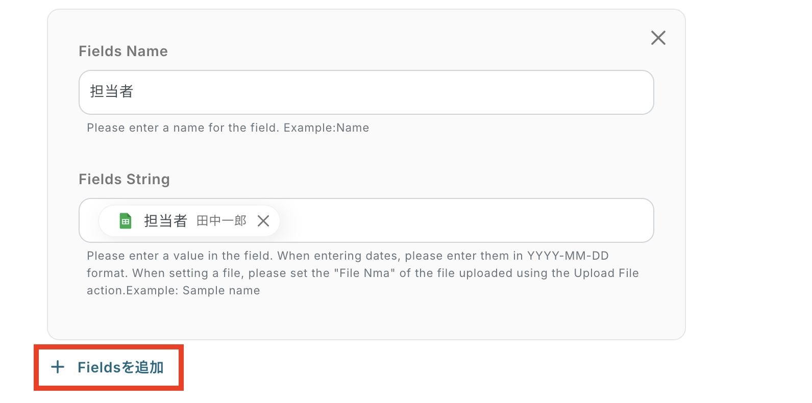 登録したい内容を増やしたい時は「Fieldsを追加」ボタンを押してください。