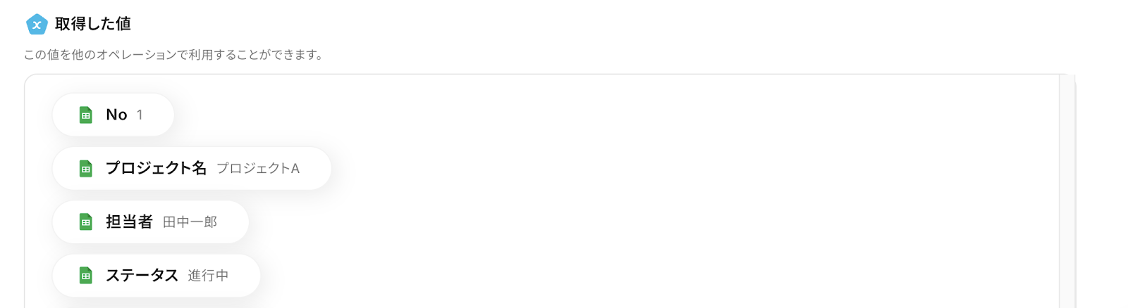 テストに成功すると「取得した値」の欄にGoogle スプレッドシートのデータがアウトプットされます。 内容を確認して「保存する」をクリックしましょう! ※アウトプットの詳しい説明はこちら をご確認ください。