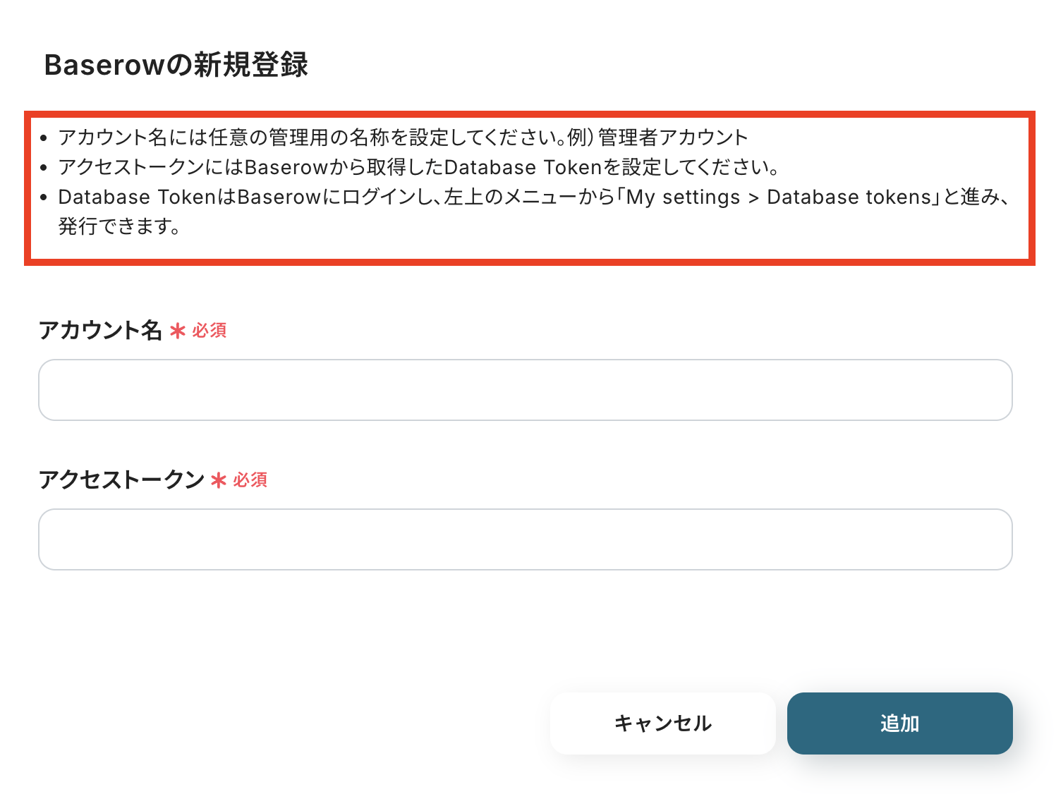 Baserowを検索すると新規登録画面が表示されます。 赤枠部分を確認しながら「アカウント名」と「アクセストークン」を入力できたら連携完了です!