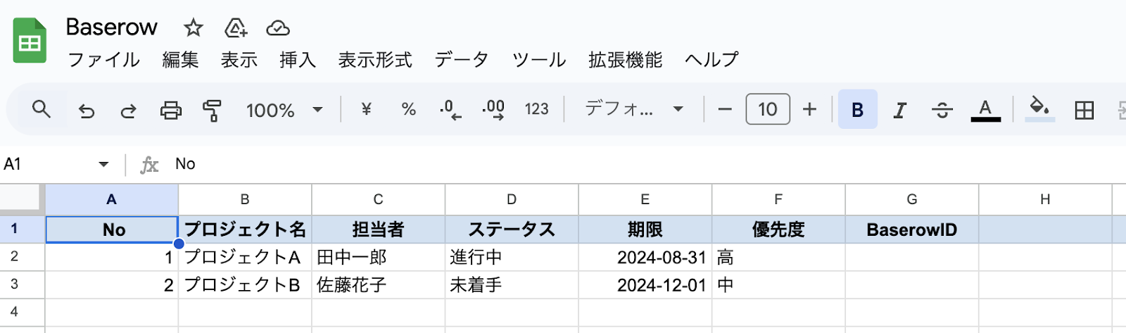 次は、スプレッドシートの情報を入力していきます。 今回はテスト用として、画像のようなシートを事前に準備しています! ※「BaserowID」を入力する欄も事前に作っておきましょう。詳しくはステップ5で解説しますね!
