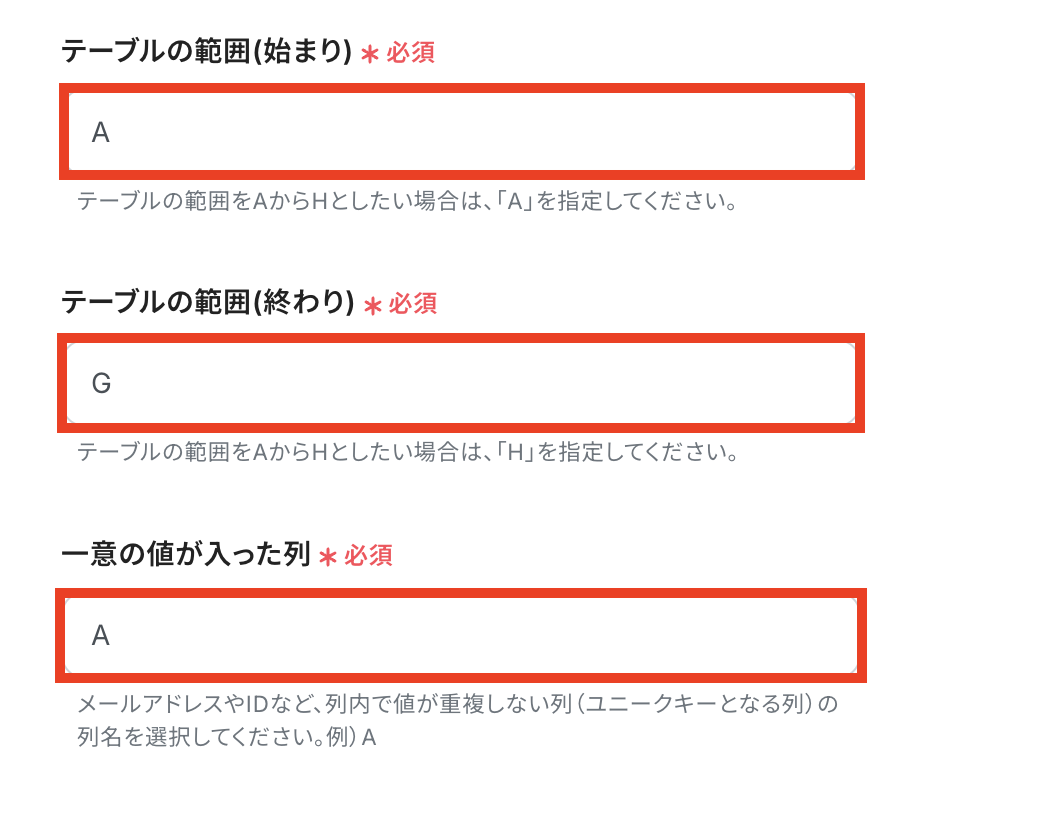 「テーブルの範囲(始まり)」「テーブルの範囲(終わり)」「一意の値が入った列」もシートに合わせて入力します。 入力が完了したら「テスト」を押しましょう。
