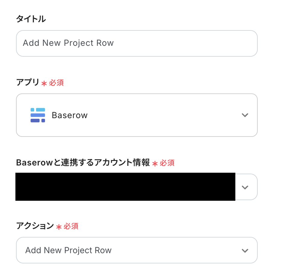 必要箇所を入力していきます。 「タイトル」:必要に応じて変更可能 「Baserowと連携するアカウント情報」:合っているか確認 「アクション」:「Add New Project Row」を選択