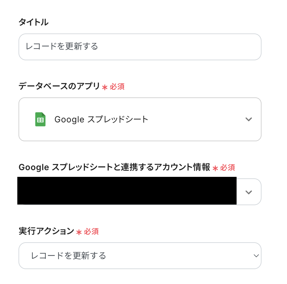 必要箇所を入力していきます。 「タイトル」:必要に応じて変更可能 「Google スプレッドシートと連携するアカウント情報」:合っているか確認 「トリガーアクション」:「行が追加されたら」を選択