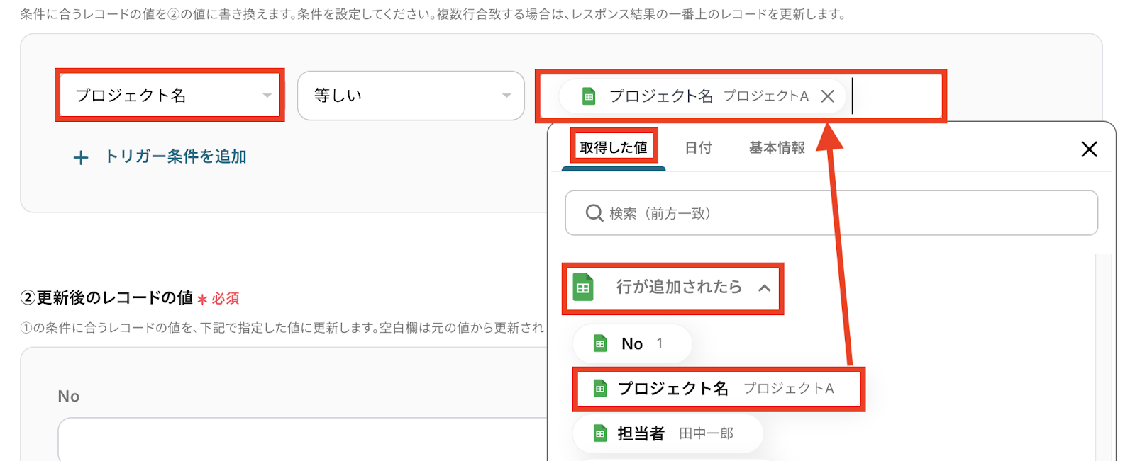 「更新したいレコードの条件」を画像のように取得した値を活用して入力します。 ※プロジェクト名以外の「No」など他のレコードと一致しない項目であればOKです!