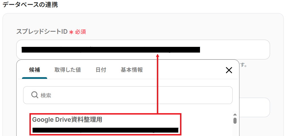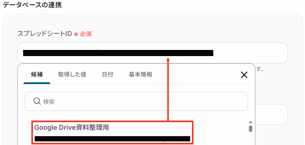 次に、先ほど用意したシートのスプレッドシートIDを候補から選択してください。