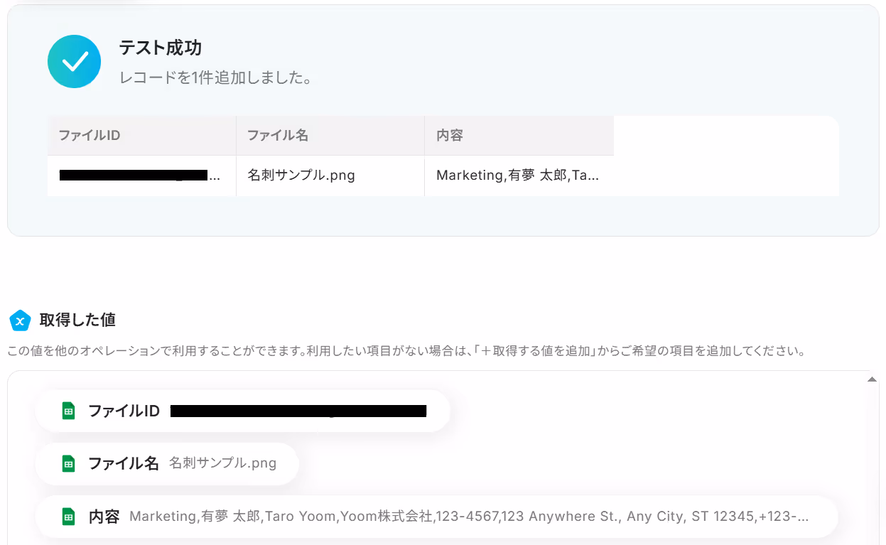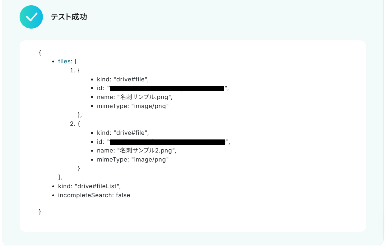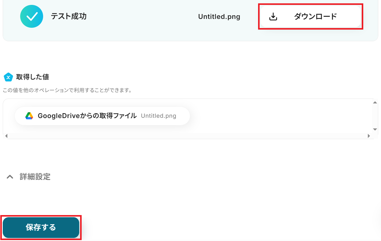 テストが成功するとテスト成功画面と取得した値が表示され、Google Driveのデータが確認できます。「保存する」をクリックして完了です!