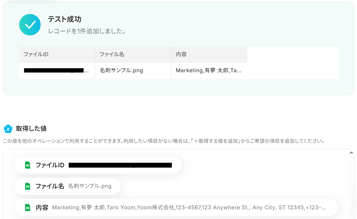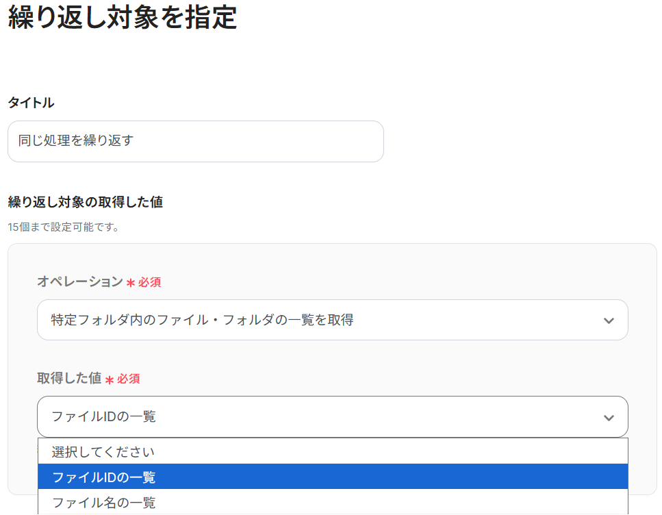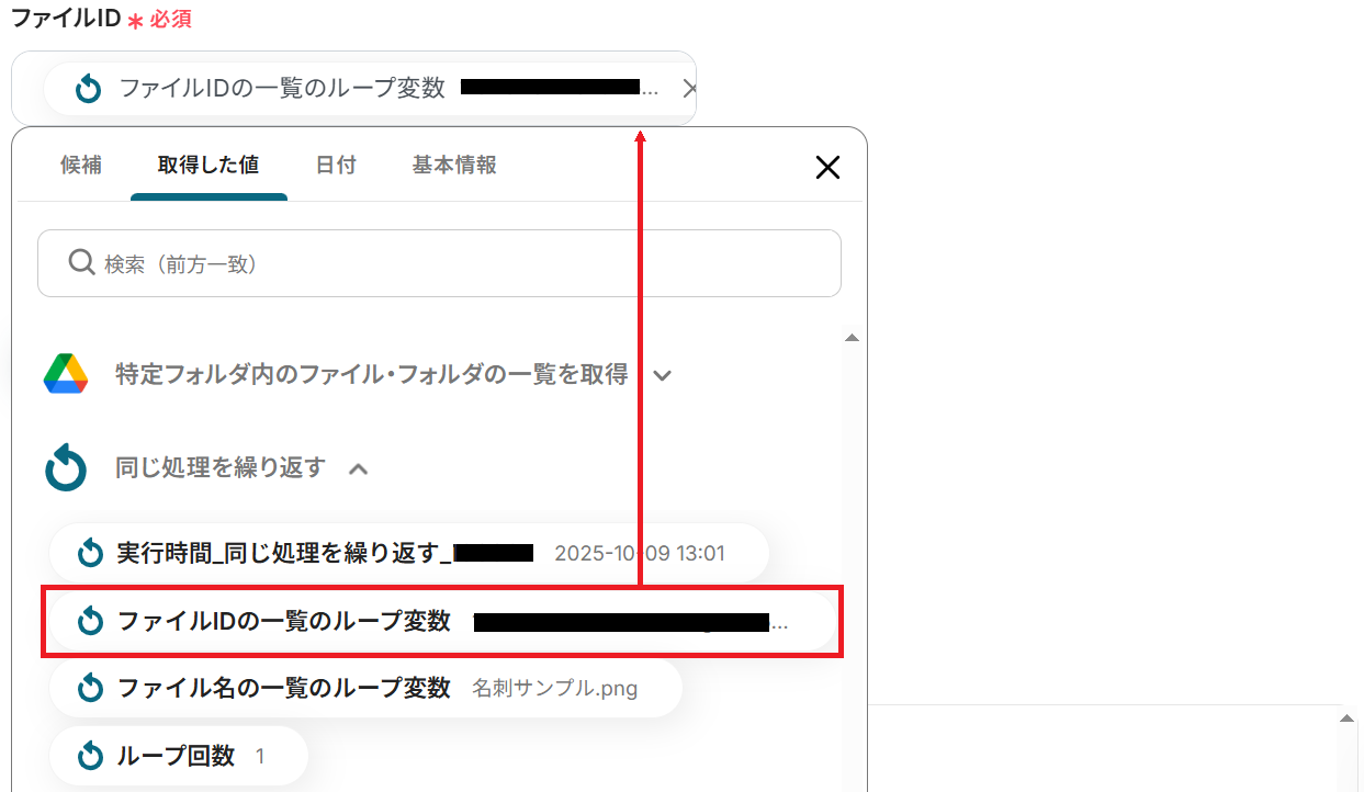 ファイルIDの欄に、繰り返し設定をもとにした「ファイルIDの一覧のループ変数」の取得した値を設定してテストしましょう。