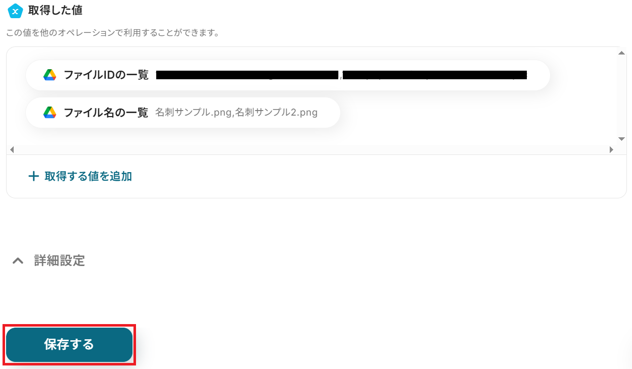 取得した値が「ファイルIDの一覧」と「ファイル名の一覧」であることを確認して保存しましょう。