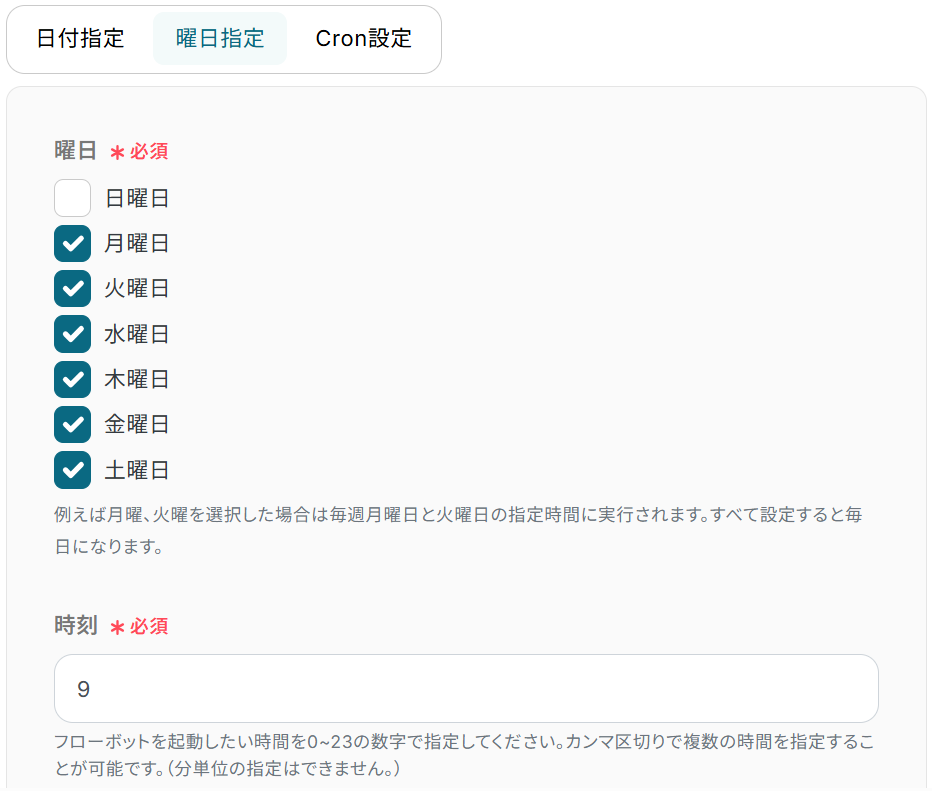 2) 曜日指定の場合:フローボットを起動したい曜日にチェックを入れ、時刻を入力