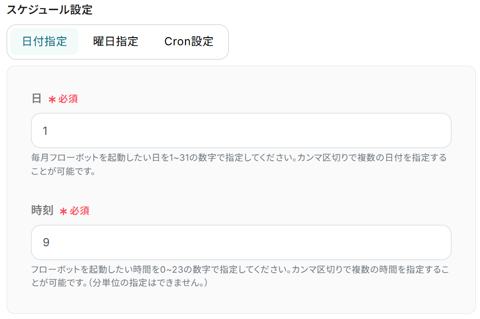 なお、スケジュール設定は日付指定・曜日指定・Cron設定の3種類あります。ご自身の業務に合わせていずれかで設定し保存しましょう。