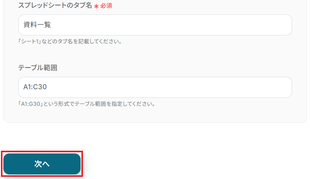 同様にスプレッドシートのタブ名も選択し、任意でテーブル範囲を選択して「次へ」をクリックします。