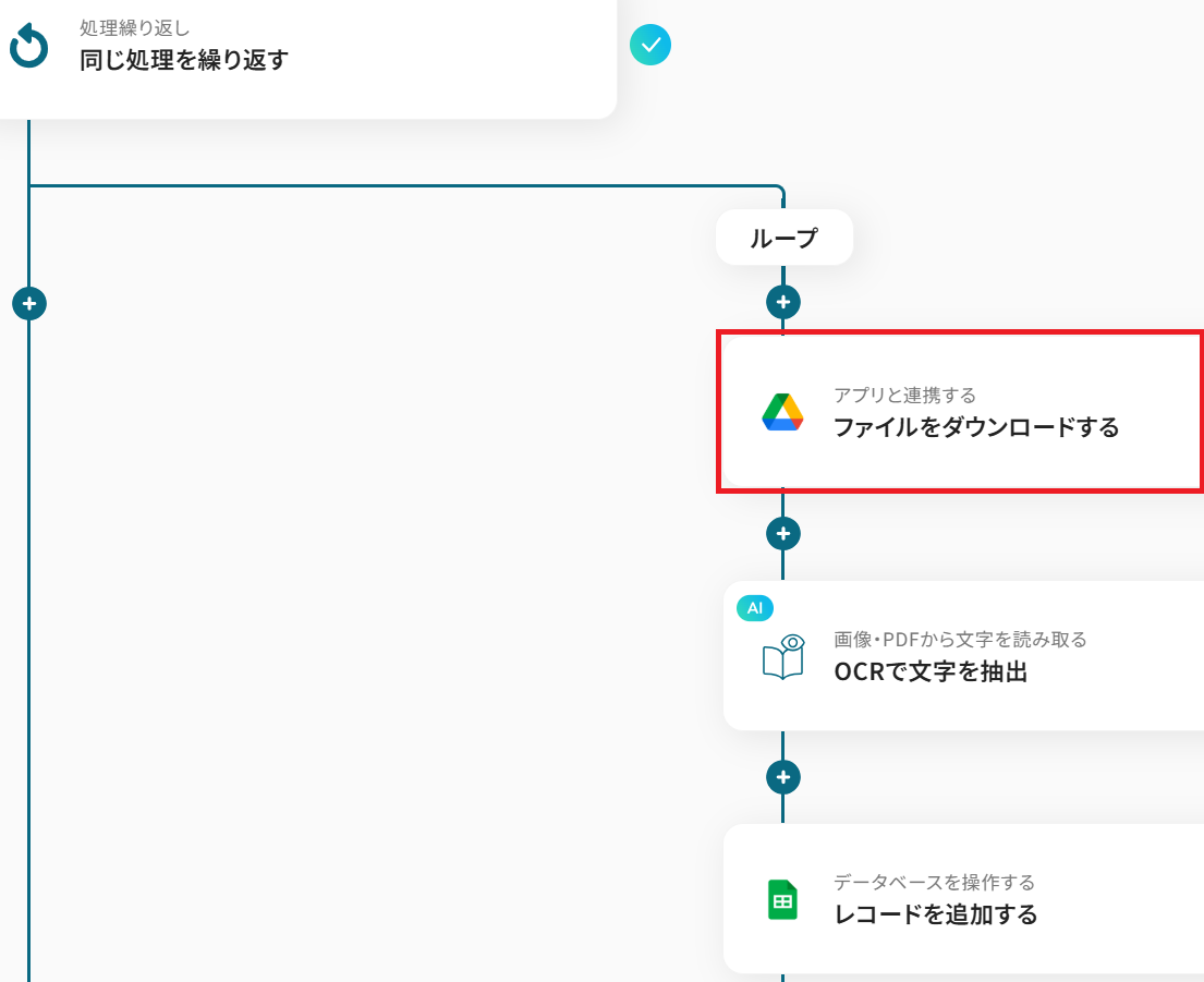 Google Driveなどのストレージサービスに保存された複数のファイルを一括でOCR処理し、抽出したテキスト情報をGoogle スプレッドシートなどに自動で記録するフローです。これまで時間のかかっていたデータ入力作業を効率化し、入力ミスも防ぐことができます。