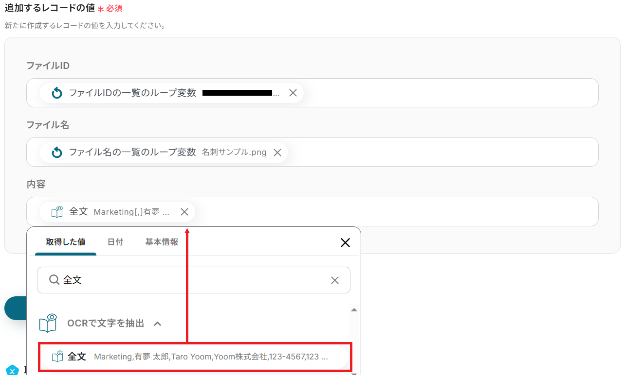 以下のようにループ変数・OCRから取得した値を指定すると、処理を繰り返すごとに各ファイルの値が反映されます。