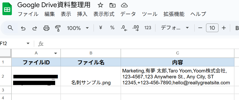 Google Driveのファイル情報とそのOCR結果が、用意したシートに自動で追記されました!