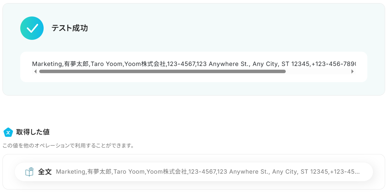 抽出したい項目は今回「全文」としていますが、一部だけ読み取りたい場合は必要事項をカンマ区切りで入力しましょう。