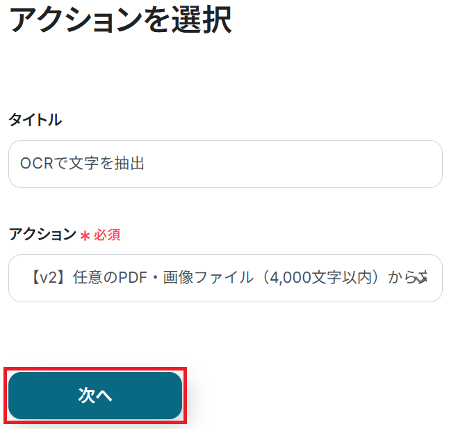 ステップ4・6と同様、アクションは「【v2】任意のPDF・画像ファイル(4,000文字以内)から文字情報を読み取る(5タスク)」のまま「次へ」をクリックします。