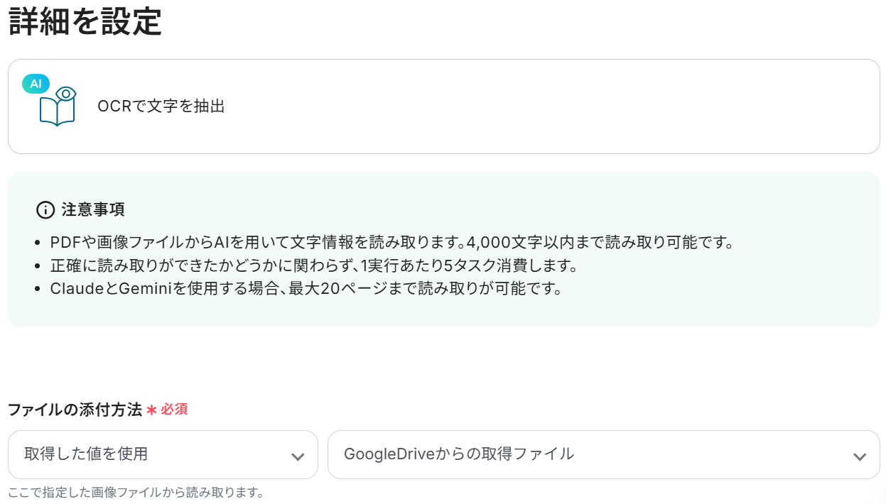 ※YoomのOCR機能では、アクション記載の規定の文字数を超えるデータや、文字が小さすぎる場合に正しく読み取れないことがあります。文字数や文字の大きさには少し余裕を持たせてご利用ください。