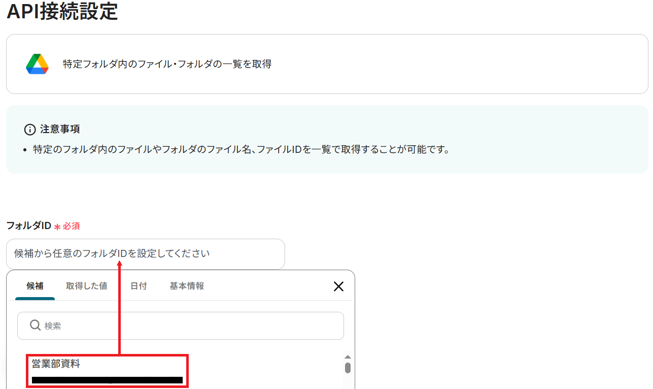 API接続設定という画面に移るので、先ほどファイルをアップロードしたフォルダIDを候補から選択してください。