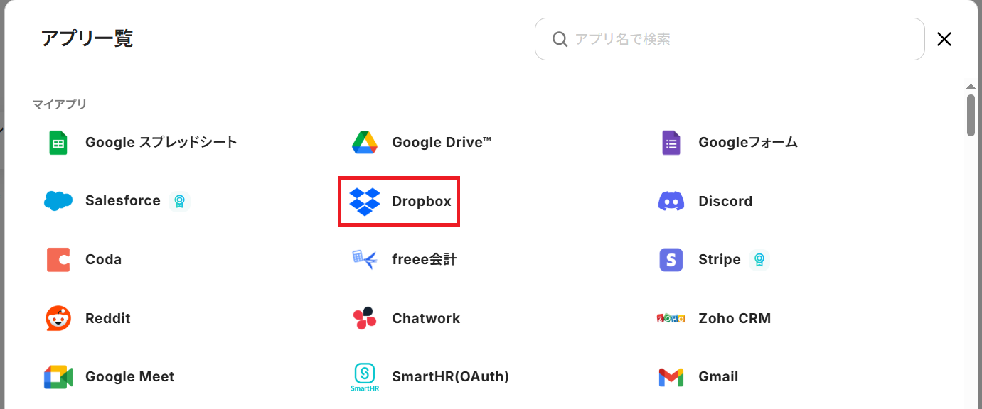A:可能です。例えばDropboxと連携したい場合、2つあるGoogle Driveのアクションを連携アカウントとアクションを選択する画面で以下のように変更してください。